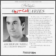Elliott's body is buried by The Liars, knowing they will most likely face criminal charges if anyone finds out what they did. Toby later finds out "Elliott Rollins" is an alias that he assumed from a deceased doctor. At the end of the episode, Hanna and Mona find his burner phone in Elliott's car because of a call from Jenna Marshall. This way, his real name is revealed to be Archer Dunhill.