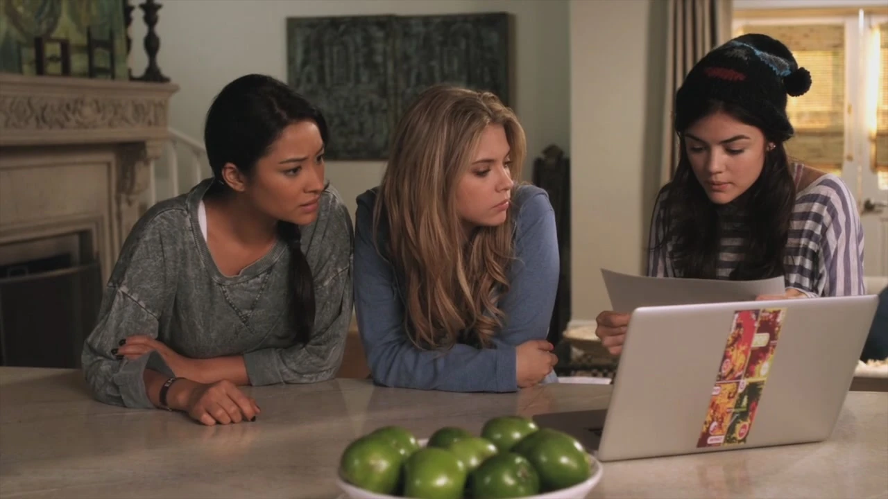 Aria and Emily returns from a movie. Aria is seen commenting on how she missed half the movie because the dude in front of them was making sales call and that if Spencer was there she would have pegged the dude with her jelly beans. Emily gets a little annoyed to hear Spencer’s name. Aria tells Emily that she was sorry but Emily should not keep holding on to the grudge she felt. According to Aria, Spencer was “just trying to protect” Emily. But Emily thinks that Spencer was trying to control the situation like she always does and she did a mistake by trusting Spencer. They are at Aria’s front door when they hear loud music coming from inside the house. They go in and find that Mike had turned the whole place into a party. Aria orders Mike to get all the people out in ten minutes. She and Emily go upstairs. Aria and Emily finds Mona coming out of Aria’s bedroom. When Mona is asked what she is up to, she says that she was invited by Mike who does not tuck and toll every time Mona walks into a room. Before leaving, Mona comments on Aria’s wallpaper and zips her bag.