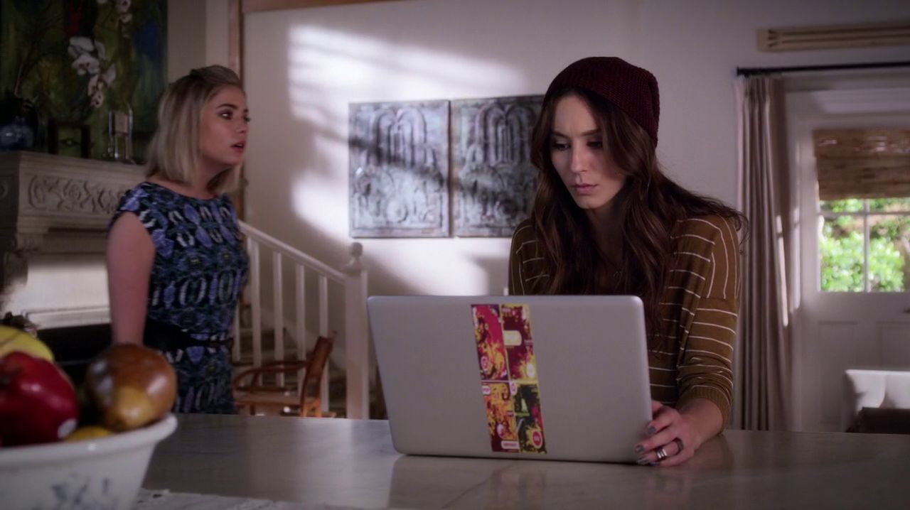 At the Hastings Household, Hanna is nervously walking back and forth while Spencer is on her notebook, investigating about the scholarship money from the Carissimi Group. Hanna is upset her Mother doesn't want to go to the police, since she is sure the police could use the check to track down "A". Spencer tells her all the have to find out is, if Charles was the one signing the check. They decide to bring the money back by themselves, and at the same time they would be able to get inside the Carissimi Group and find more information.