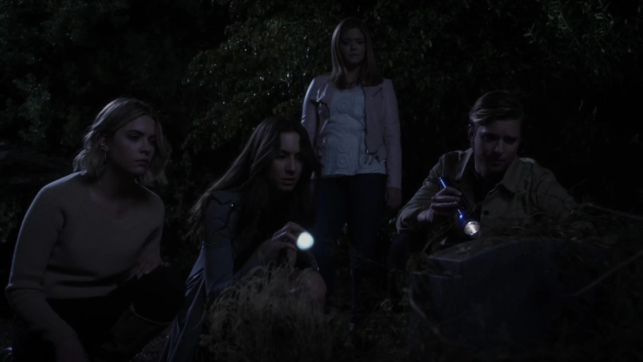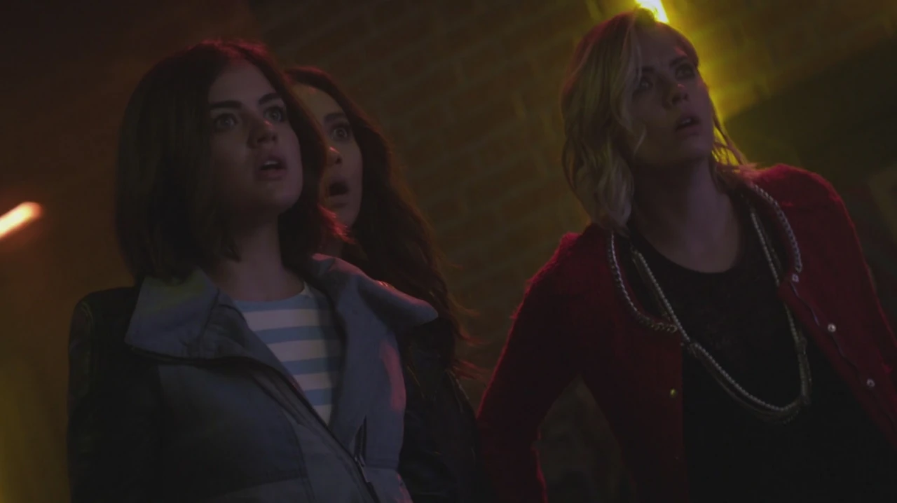 The girls try to find their way out. They look for Mona and help her out of the hole she was put it, they all reach an exit but can't get out, however fortunately the smoke from the vault created a signal for Alison, Caleb and Ezra-who had been tracking and researching a way to find the girls. They open hatch and the girls come out of it. Hanna and Aria hug their respective partners, Emily and Alison hug each other, and Mona and Spencer hug each other. Toby and the Police arrive and Spencer leaves Mona to hug Toby. Toby tells her that the police force figured out that A is Andrew Campbell, Spencer becomes confused by this but doesn't question him. The police search inside and find another girl, the Liars question if she was down there the entire time that they were and if so why they didn't ever see her.