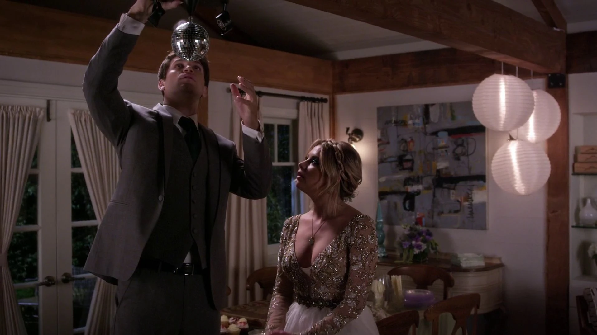 After the presents are opened, They play a version of 21 Questions: "How Well Do You Know the Bride and Groom?". Aria quietly asks why Mona is here since she and Spencer had it out at The Brew. Emily skeptically says that she brought a gift, causing Spencer to add: "Yeah, and an axe to grind". Ashley asks Emily if she knows how Jordan and Hanna met but she doesn't. Ashley then asks Spencer, who also doesn't know. Hanna ends the game and checks her tablet and wonders what's wrong with it when it won't respond to her touch. An alarm, the same one from the Dollhouse, blares, and loud rock music plays; Ashley tells her to fix it, but her tablet malfunctioned and she doesn't know how to stop it. Spencer takes the tablet from her but the lights shut off. Emily asks what's happening, but no one knows. Ashley tries turning the lights on, but it's the air conditioner, which blows everything around; one of the present bags falls over. Aria walks over to pick the bag up but, as she does, the fireplace lights up and burns her. Aria is taken to the Emergency Room with second degree burns.