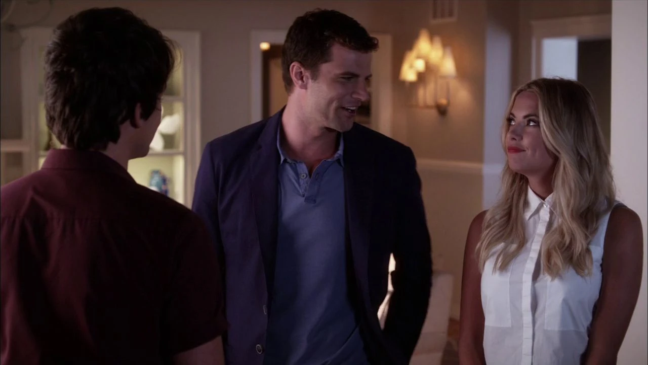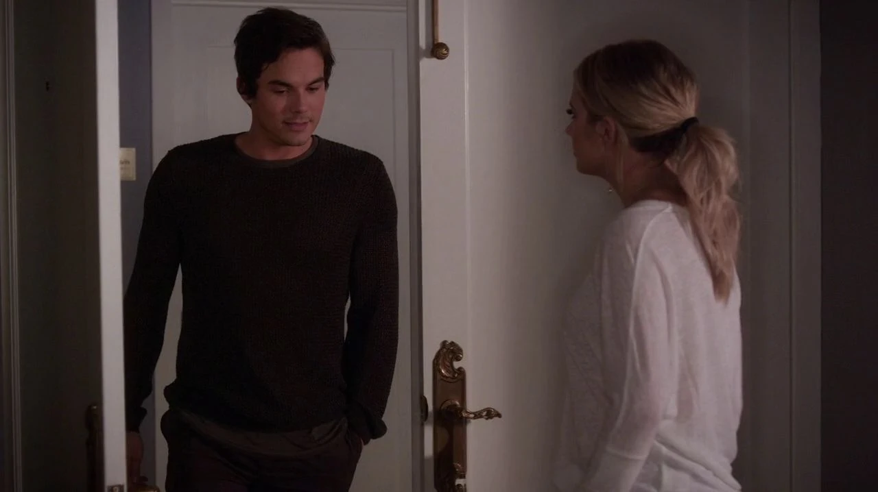 We then see Hanna on the phone with Jordan, while Lucas runs diagnostics on a tablet. She says that it's a good idea to stay in Rosewood because, if she was in New York, she'd just be thinking about Aria and the others. She adds that they're her friends and says that she'll call him later. Lucas looks up and asks if he'll get an invitation to her wedding, then adds that he was half-expecting to meet Jordan when he came back. Hanna says that Jordan is a little phobic of small towns, causing Lucas to say that he used to think that but big cities changed his mind. Hanna then gives Lucas a gift, in the form of a few ties, thanking him for letting her stay there: she also wrote post-it notes saying which tie goes with what. Lucas talks about how he came back because he wanted to look for property, then adds that maybe he's giving Rosewood a second chance. Hanna agrees saying that they left so fast that they didn't realize what they left behind, and they share a smile.