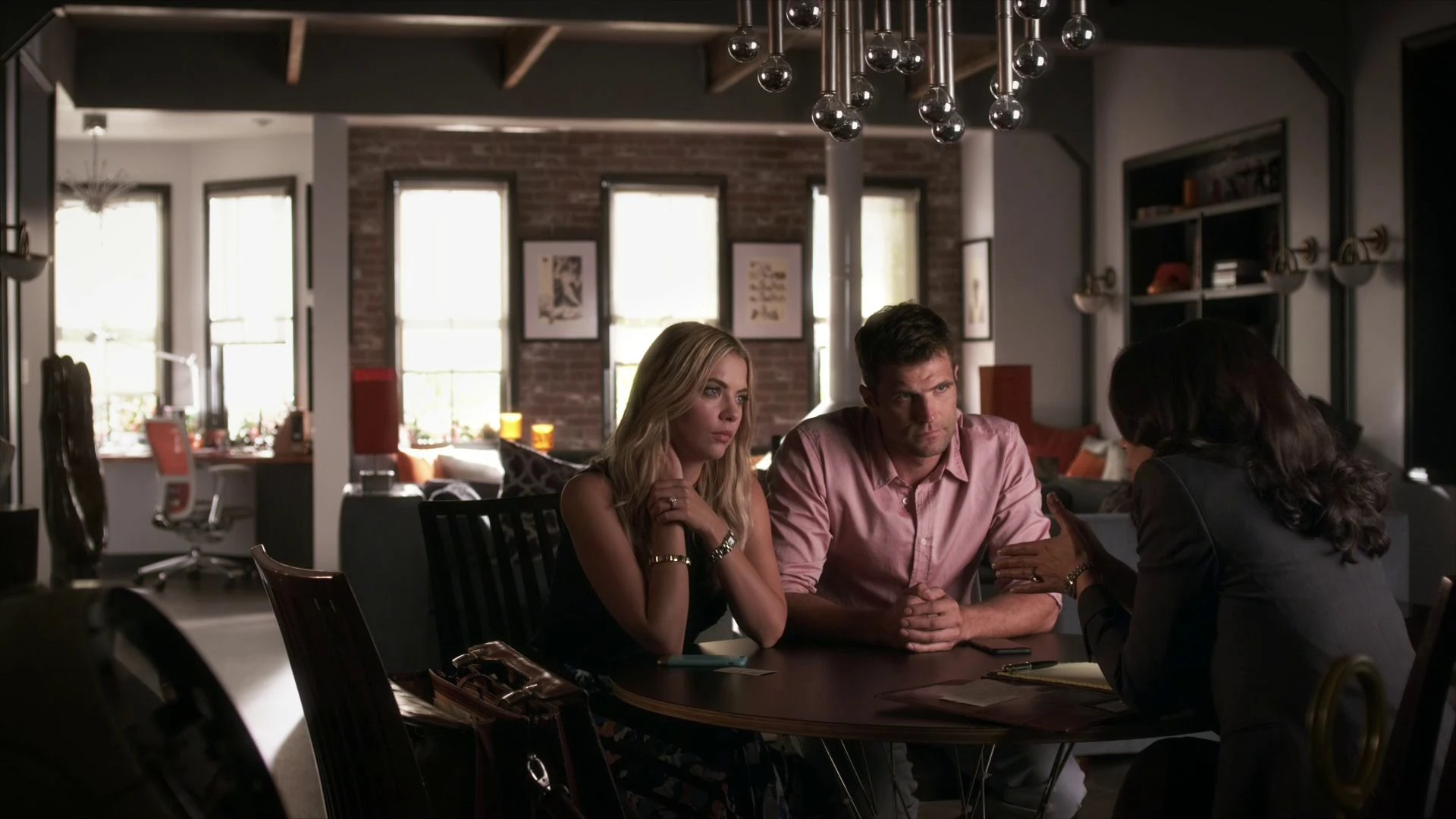 Caleb brings Hanna back to the loft. He tells her that he'll be back as fast as he can but the more he gets done tonight, the less he has to worry. The fireplace suddenly lights up, scaring Hanna and Caleb, but Lucas tells them from upstairs that he wanted to make sure it worked from anywhere in the apartment. He walks downstairs to greet Caleb, who says he would ask how he's doing but he's a stockholder so he already knows. Before Caleb leaves, Lucas asks if they can do lunch sometime and Caleb agrees. Hanna sees a picture of an empty factory and Lucas tells her that he's buying it; she asks what it will look like when it's finished and what he'll do with it. He shows her a picture of what the finished product will look like and says that he can do whatever he wants with it, before asking what she would do with it. She says indoor miniature golf, but he wants a serious answer. He says "If somebody told you that you could try anything, you know, start your own business. What would you do?". She tells him not to joke like that and he asks "Who's kidding?" and smiles. Hanna says that she would set herself up with new designers and start her own brand. Lucas says that it's a deal. A stunned Hanna is speechless and Lucas says that this will be a good way for her to keep one foot in Rosewood and figure out what she left behind. Hanna is hesitant to accept the offer, but Lucas assures her that the offer still stands and that she should talk to Jordan about it.