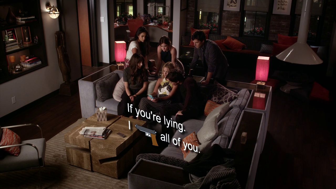 Caleb, Ezra, and the Liars wait for a text from "A". Aria finishes a phone call with Alison and tells the group that Ali will be heading back tomorrow, but Elliott is going to a conference in Chicago. Emily says that Alison shouldn't be alone, prompting Ezra to agree that none of them should until this is over. Hanna tells them that she's typing and the response says: "If you're lying, I shoot all of you". Spencer asks Hanna if she's sure she wants to do this, Hanna tells her that the next person could be in a casket instead of a hospital bed if they don't. Spencer says that they can un-decide, prompting Hanna to snidely say that she trusts Caleb. Spencer says she does too and Hanna texts "A" back saying "It's the truth. I'll call the cops". She soon gets another text saying "No police. This is between you and me". Caleb says that Sara took the bait; Hanna sends back a text saying she needs one more day and "A" says "It'll be your last".