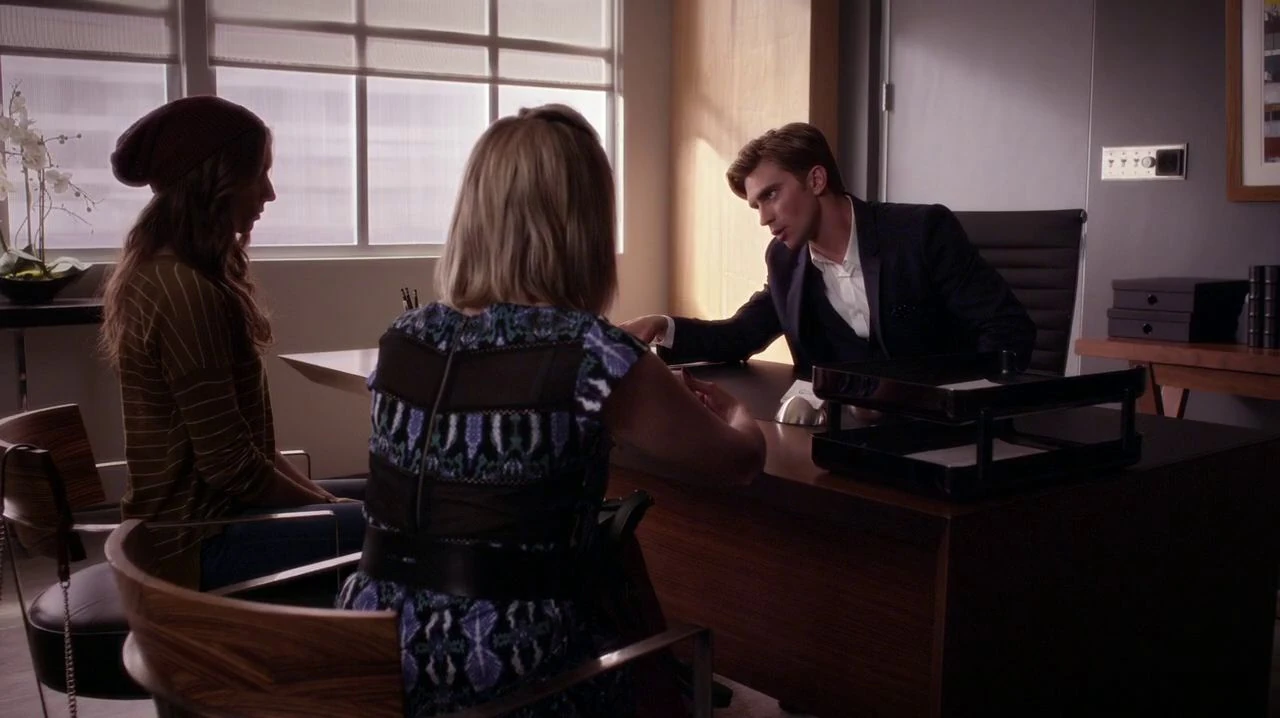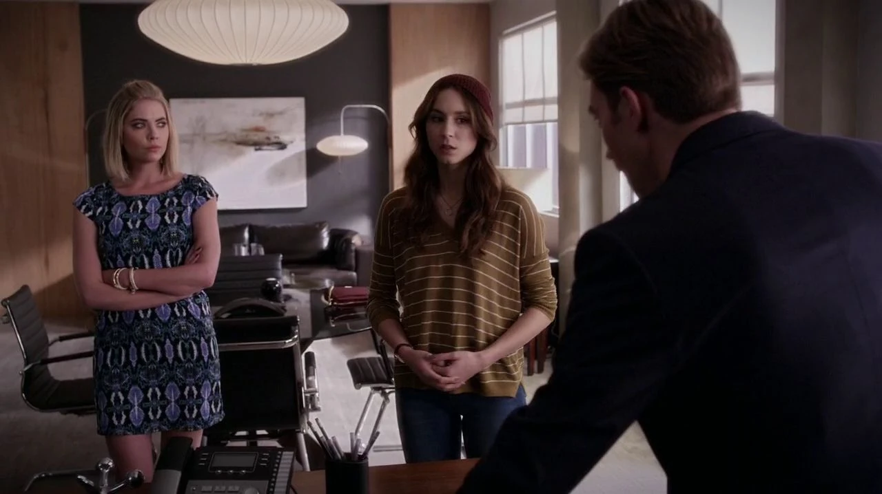 Spencer and Hanna enter Rhys Matthews' office at the Carissimi Group. As Rhys is not there, Spencer takes the opportunity to search for possible clues to Charles. Hanna notices a mirror and gets a little paranoid. She asks Spencer to stop touching things, as she thinks it could be a two-way glass and somebody is watching them or listening to them. However, Spencer tells her she is acting ridiculous and Hanna throws a paper at her. Just in that moment Rhys comes in and asks how he could help them.