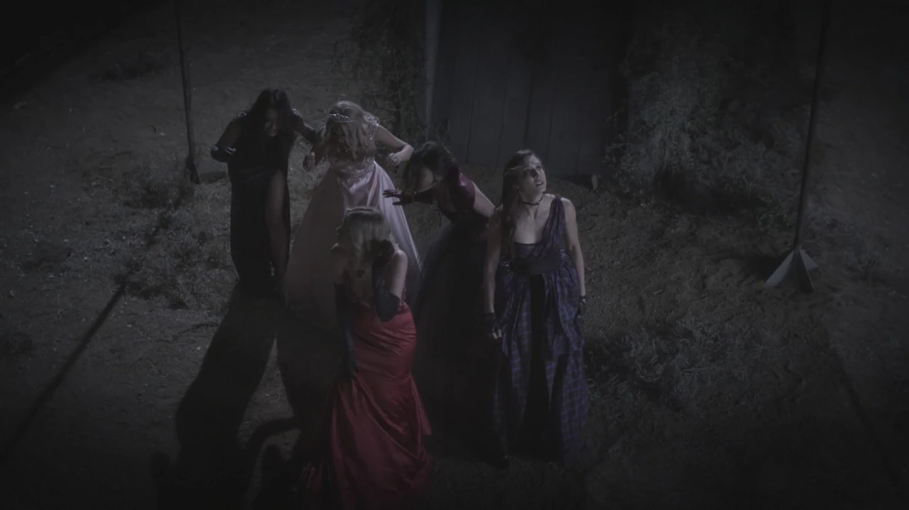 The girls try to figure out where they are and Hanna facetiously comments that they could be in the Amazon. Spencer corrects her that they are in the northern hemisphere because the moon is waning. Hanna tells Spencer she was being sarcastic. The weather changes and it starts to rain, they hear thunder and see lighting and Emily says that the fence is basically a giant lightning rod. Hanna looks at the camera and asks "You gonna let us fry out here?" thunder and lightning crash loudly together and the girls become scared and huddle together.