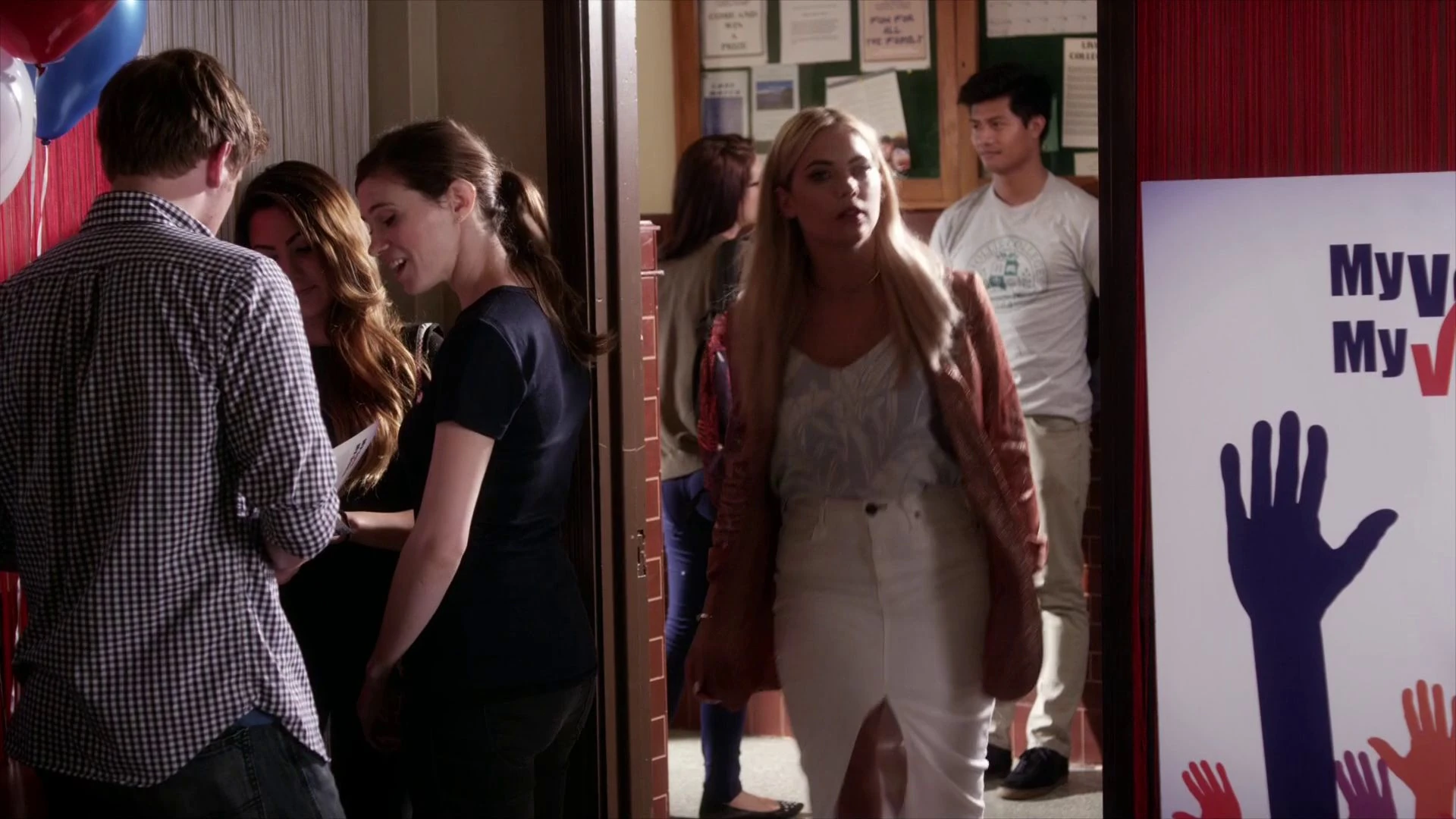 Spencer shows a picture of Alison in a hospital gown to Aria, Hanna and Emily; she says that Alison said it was an accident, then asks if they believe that. Hanna sarcastically says, "As much as I believe that Aria being seared was an accident", causing Spencer to say that two of the five of them being in the hospital is 40%: 60% if you count what happened to Emily's eggs. They agree that the odds aren't going to get better the closer they get to election night, which is three days away. Hanna says that she wants to check up on Ali, causing Aria to say that she's supposed to be back tomorrow. Emily says that she should be going the other way, and Spencer says that she should check up on her but not to freak her out. Spencer says it might be best if she stays away until after the election. Aria asks what they're supposed to do about Mona, causing Spencer to say that they keep a close eye on her. Hanna insists that Mona couldn't have killed Charlotte, causing Spencer to say that Mona has changed herself so many times that she doubts she could recognize herself. Hanna rhetorically asks who hasn't tried to reinvent themselves a couple times, then leaves to go visit Ali.