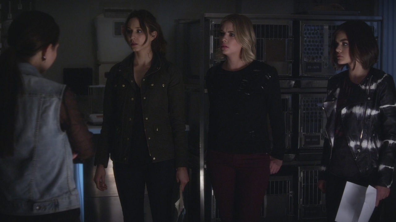 Spencer and Hanna are in the alley and Spencer says the key card will help them get into the college. Spencer asks about Caleb and, upon realizing that Hanna is still shutting him out, tells him not to. The two see several pairs of non prescription glasses in Lesli's car, as well as animal cages in the trunk, and Spencer says that the cages are large enough for them making the two uneasy.