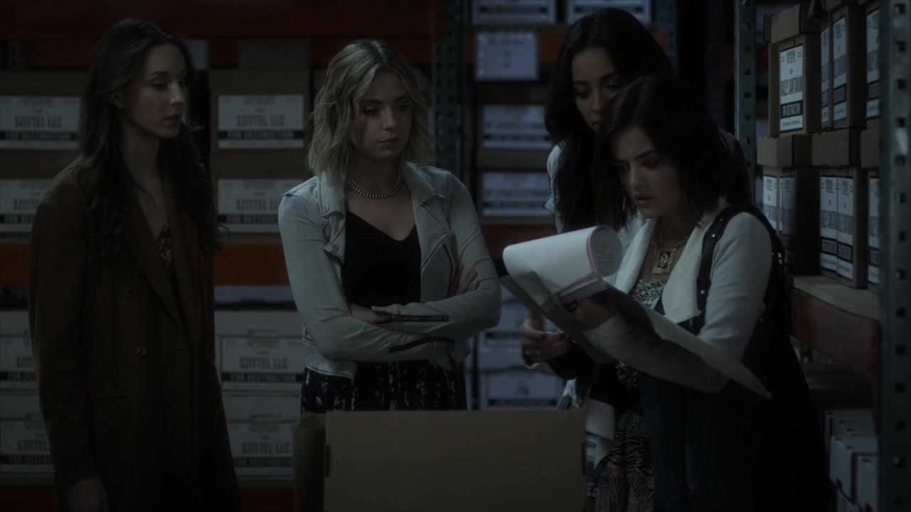 Aria, Hanna and Emily wait outside Radley for Spencer, Spencer tells them that the receptionist won't give out her file, it has to go through Spencer's doctor first. Also implying they haven't been shredded yet. Emily figures out a way to get into the warehouse where they keep the files, Spencer says they can talk to Alison and Jason to figure out how to get to Charles' file. Hanna tells the girls to wait as she sees two workmen loading boxes of files into a truck. When the men aren't looking, the girls sneak into the warehouse. Spencer looks out for them, making sure they don't get caught, while the girls look for the file. Hanna and Emily talk about the groups friendship status, aware that, mentally, the events that happened in the Dollhouse are taking a toll and they're not as close as they used to be. Emily tells Hanna that while they're in a rough spot, they're gonna be back to normal eventually. The girls find the file and find out that before he turned 16, his doctor asked for an increase in medication for his severe depression, and that Carol Ward and Jessica DiLaurentis were the only two people who visited him between the ages of 13-16. Hanna is relieved 'cause they can visit Carol but Emily reveals that Carol died when the girls were in sophomore year-(and unfortunately Jessica is also dead). Spencer tells them to check the boxes to make sure they didn't miss anything, but the workmen come back in and they sneak back out. The girls are taken by surprise when they come out and find Caleb standing there, he gives Hanna a disappointed look for lying.