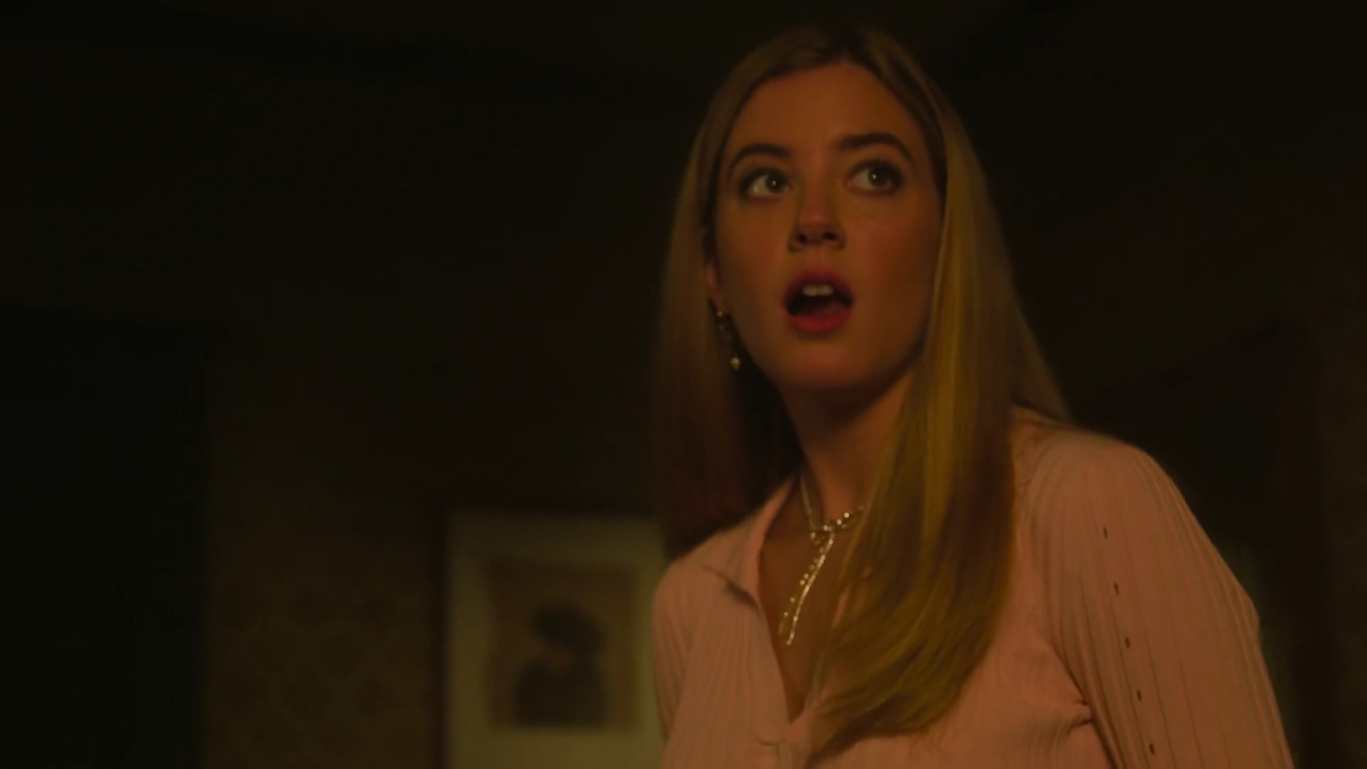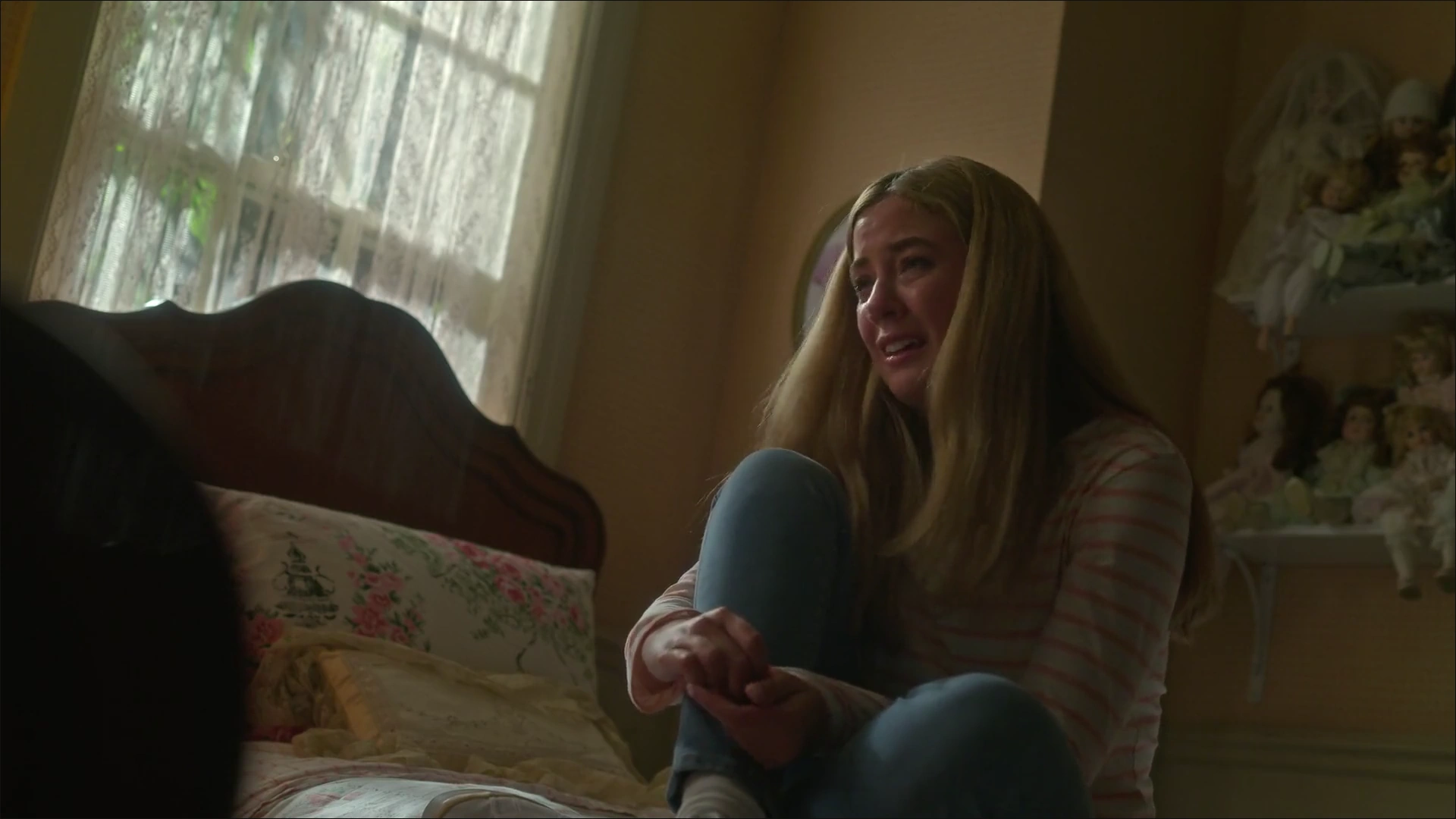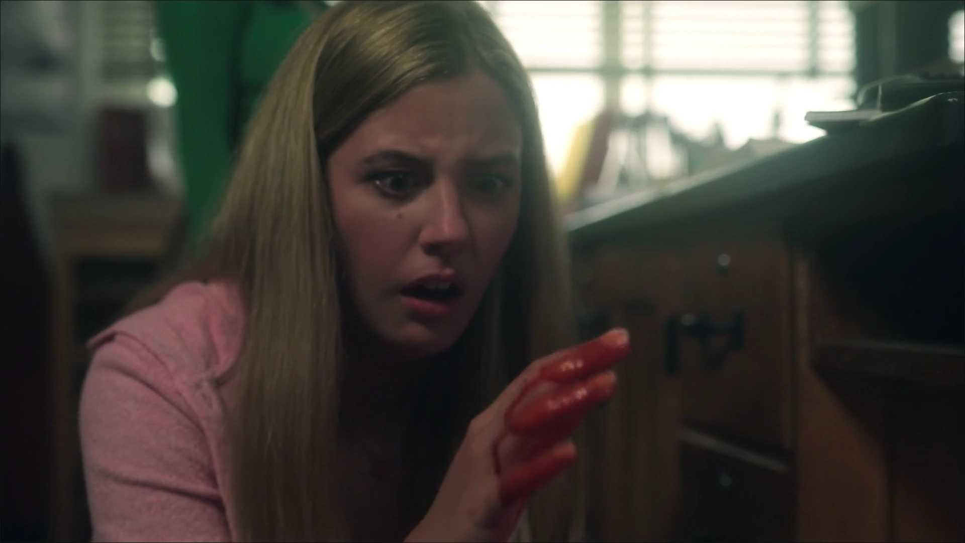 Karen briskly skims through Imogen’s closet the latter who says she gave her the shirt she’s holding. Karen snidely remarks she can’t wear it now. Imogen begs Karen to understand that Greg kissed her first, not vice versa. Karen, however, refuses to listen, confronting Imogen that she kissed Greg at her own party. The blonde tries to storm off but finds in the hallway floor wet. The girls slowly walk to the source of the water, the bathroom. Imogen softly calls out to her mother. She pushes the door open, taking in what’s in front of her: Davie, dead in a tub overflowing with bloody water, the letter “A” drawn in red ichor on the wall. Karen screams in horror as Imogen gasps.