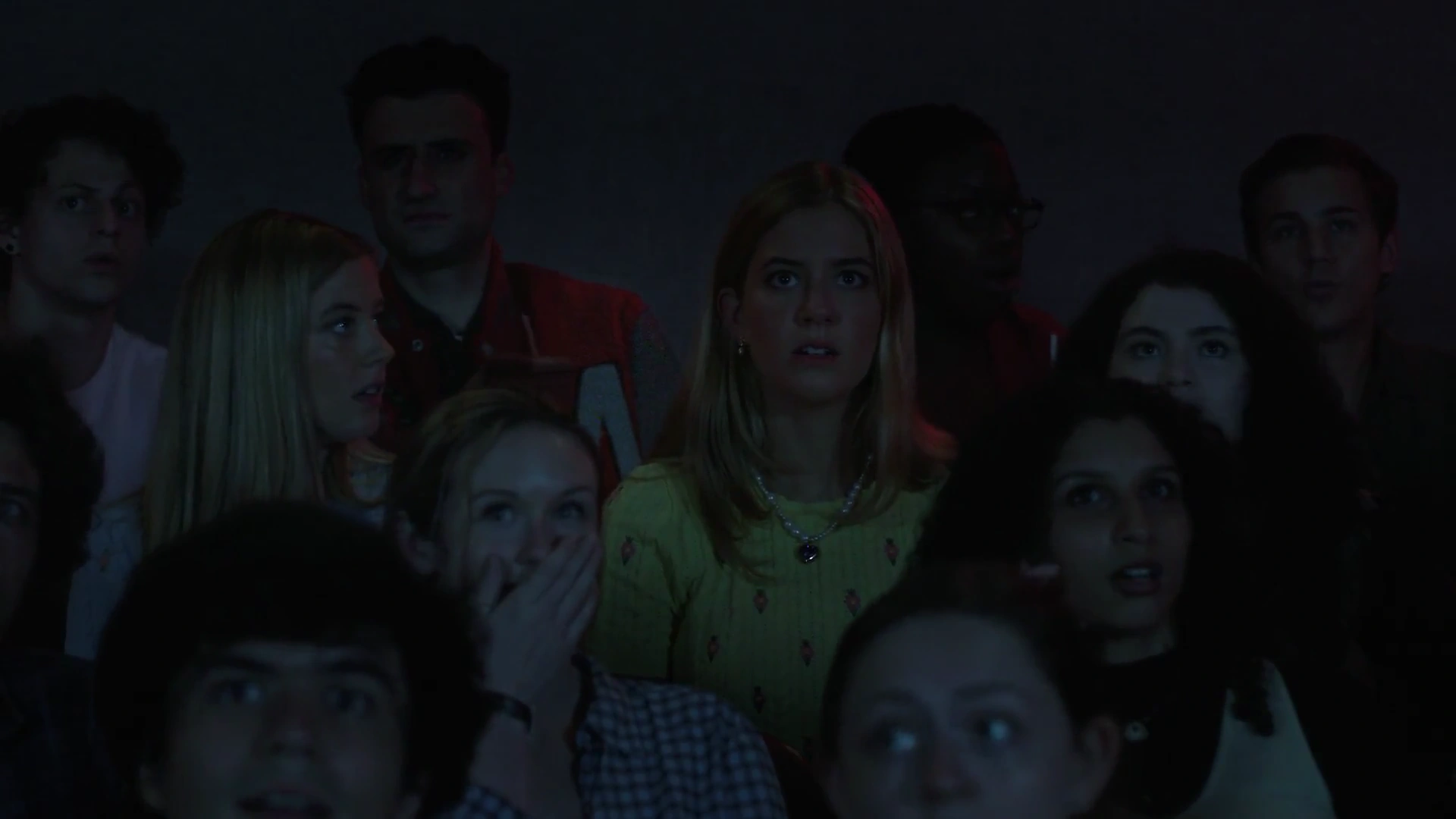 At The Orpheum, Karen, Kelly, and Sandy sit in the middle of the theatre to watch the films. The video starts with a campaign video to Vote Karen For Queen. It rolls into the video from that night. Karen is drunk and demands affirmation that she's “so fucking hot”. The boy behind the camera wants to see how she is. Karen can't believe that Greg kissed that slut when he has her. The asshole couldn't even stay hard enough to have sex properly. In the audience, Karen demands that Kelly tells her what's going on. She doesn't know. In the video, Karen continues to berate Greg while goading the boy into revealing himself. He agrees to show her but only if she shows him first. In the theatre, Karen becomes emotional and leaves the theatre. The video cuts off to show the rest of the campaign, as Karen runs out of the theatre crying. Kelly runs after her, catching the attention of Wes who enters the screening, just as the movie starts. Kelly runs after her sister.