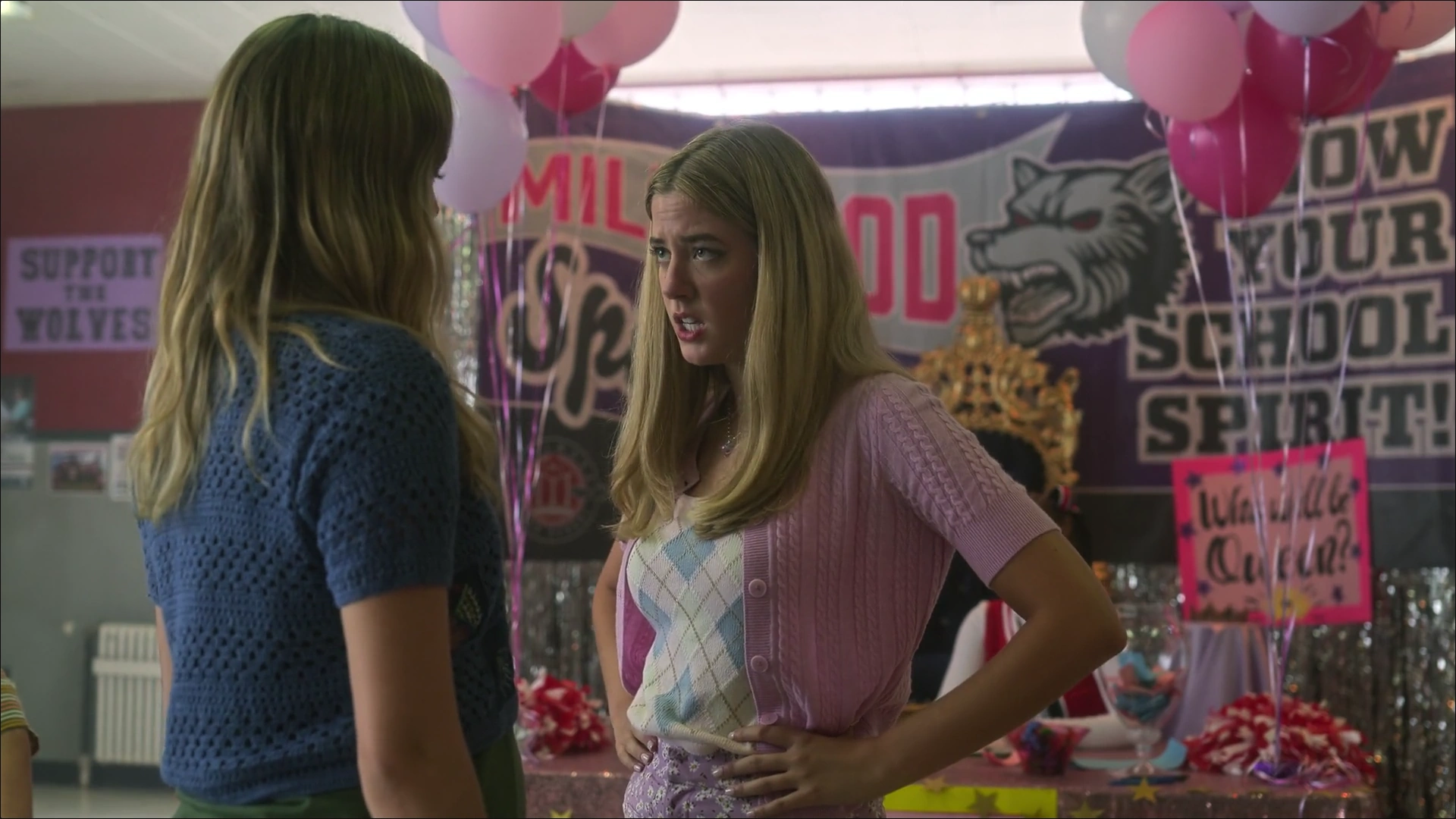 One month later on Monday, September 28th, Karen continues her crusade to be crowned Spirit Queen at the Spirit Week Dance, her minion Sandy by her side at her booth. She's surprised when Imogen Adams and Tabby Haworthe enter Millwood High. She didn't expect Imogen to come back to school. She fakes sweetly veiled surprise that Imogen is back, leading Tabby to snark that if she wasn’t such a narcissist she’s check up on Imogen. Karen coldly tells her to get off her ass as it was traumatizing for her to see, recalling back when she ran out the house screaming. She tells Imogen she’s here for her and pulls her in for a hug. However, she cruelly whispers, “People may be polite to you, but trust me: nobody wants your pregnant, tragic ass back here.” Karen wishes her a good first day back, but Tabby overheard and asks why she’s a bitch at everything.