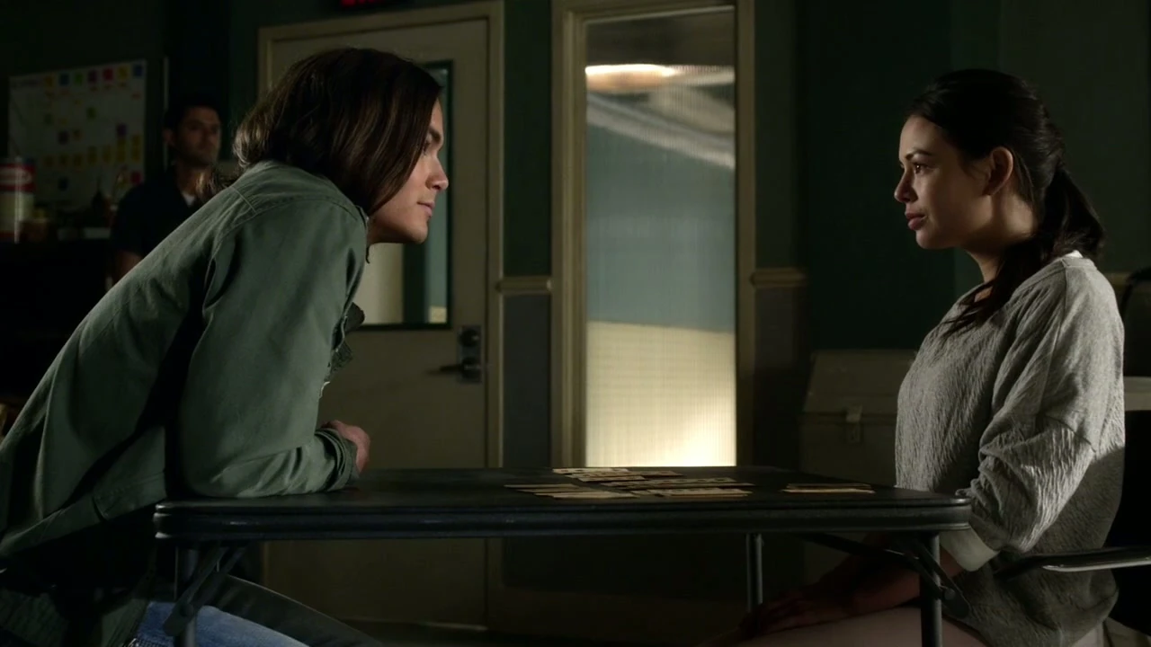 Meanwhile, Mona is paid a visit by Caleb. She has a deck of cards in her hand and is arranging them to play Klondike, but Caleb is not there for games. He tells her not to mess with Hanna. Mona is silent. He goes on to say to her that, though she's laughing at him in her head, the absolute joke is that while Caleb can walk out of the doors at Radley, Mona cannot go anywhere. Mona leans forward and comments that Caleb is a lousy kisser. Suddenly, Mona throws a hysterical screaming fit and flips over the table. Panicked, Caleb walks away.