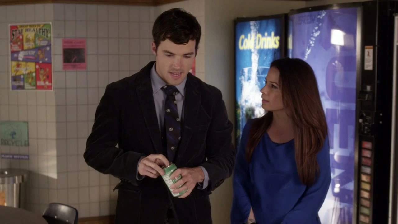 Ezra is having problems with the vending machine in the cafeteria. Ella marches in, slams the machine hard, and gets him the cold drink. Then, she asks him about what happened with the vice principal. Ezra explains that he knows Arthur Hackett hates conflict and making decisions. So, if he offered a way out of the situation, he would take it. When asked for a reason, Ezra tells her that he knows why she did what she did for Emily. After all, he's a teacher too. Moreover, Ella was once his friend.