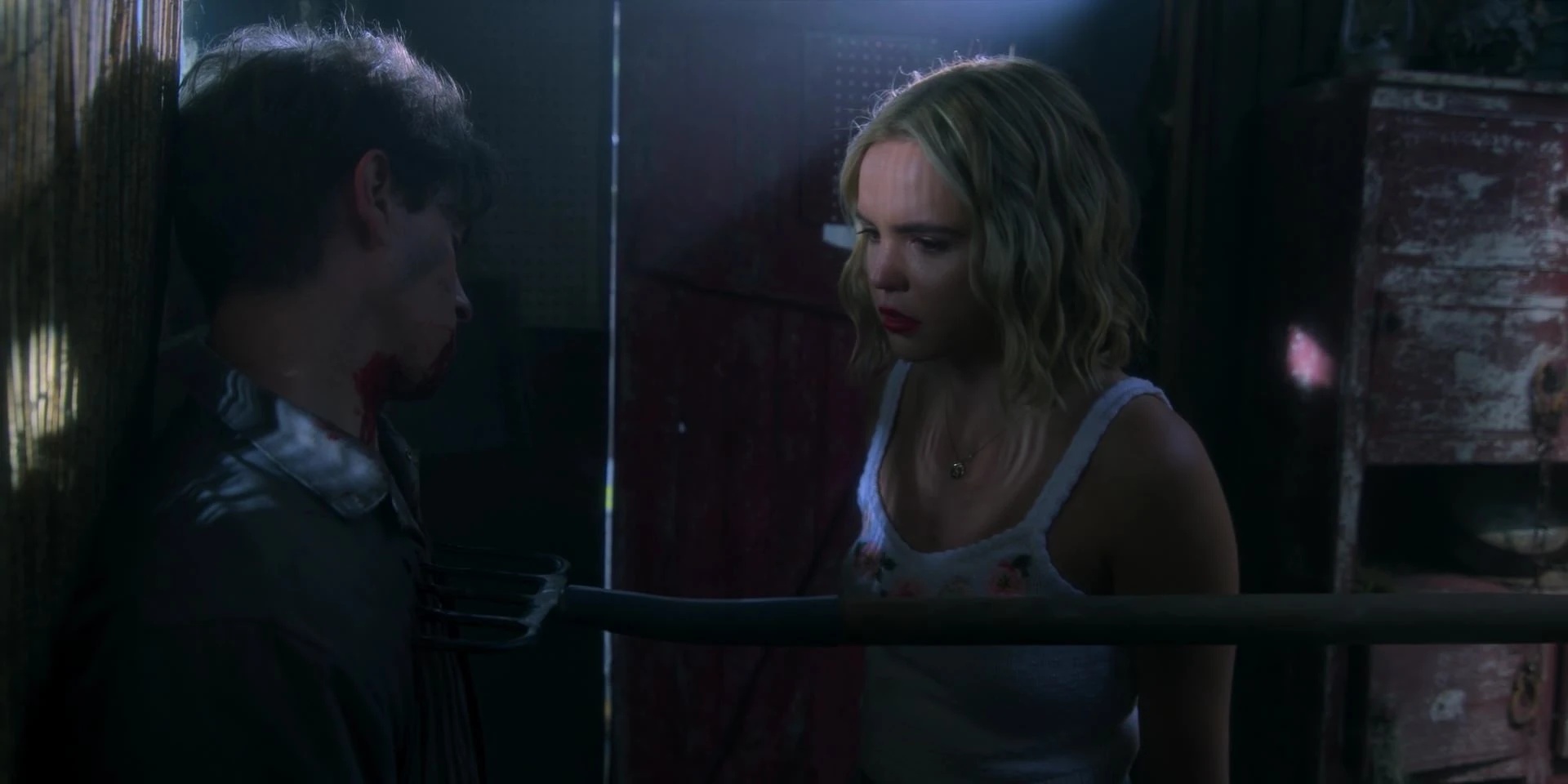 Wes tries to goad Tabby into coming out. They know how this will end because it's pre-ordained. The Reckoning demands a blood sacrifice. She tells the dumbass to turn around, wielding the pitchfork. Just because he's a horror cliche doesn't mean she is. Only a novice final girl would walk into the crazy killer's shack. He didn't find this place he built it with help from his crew. She's appreciating his set dec skills right now, especially the pitchfork. He doesn't think she has what it takes to kill him with it. Tabby charges forward with a feral scream, impaling Wes through the chest and into the wall.